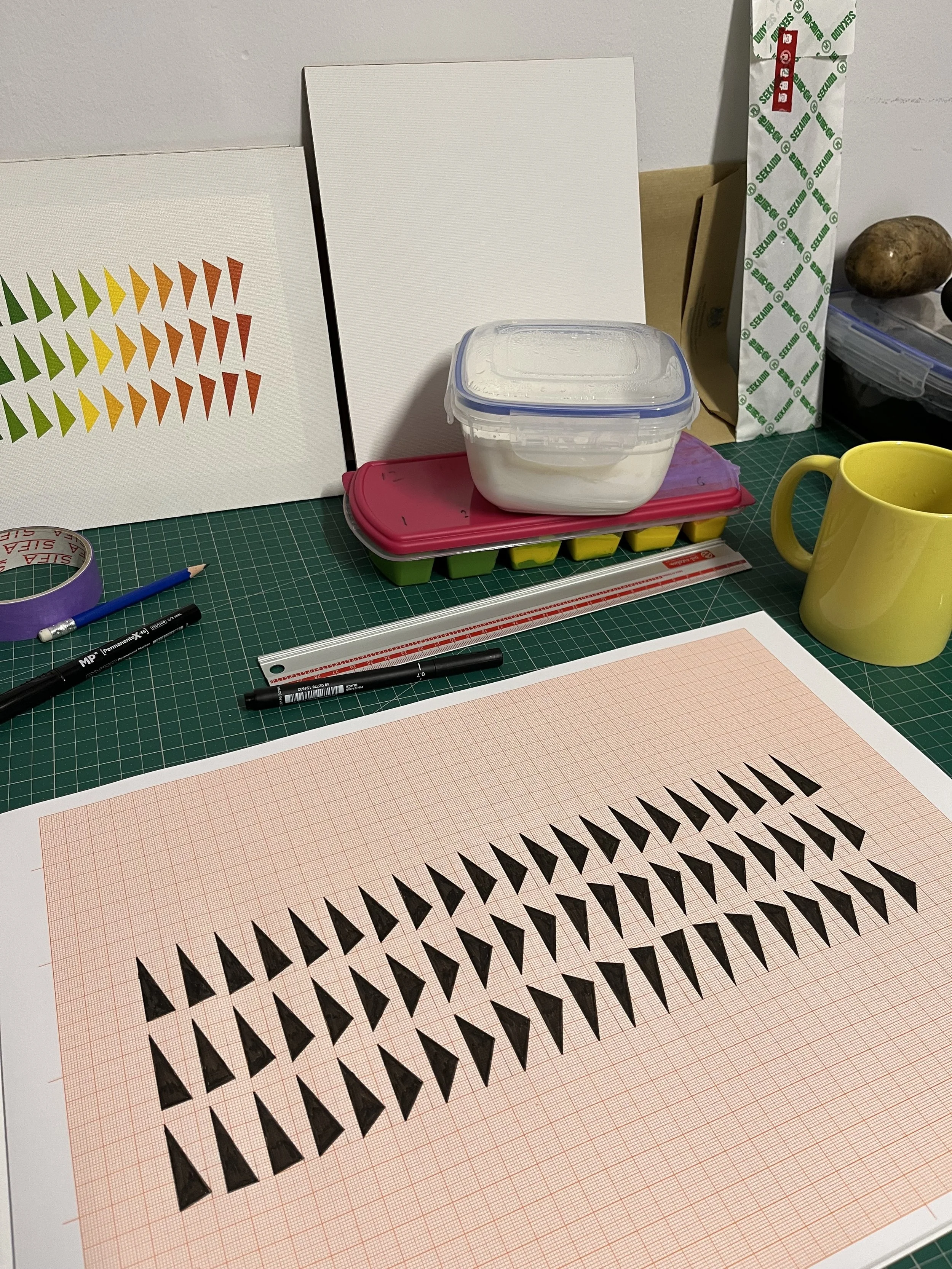 My last color study gave me an idea of how to slightly change the pattern of triangles, and this time, as I’m already happy with the colors, I decided to just do a black and white sketch to see if it works: